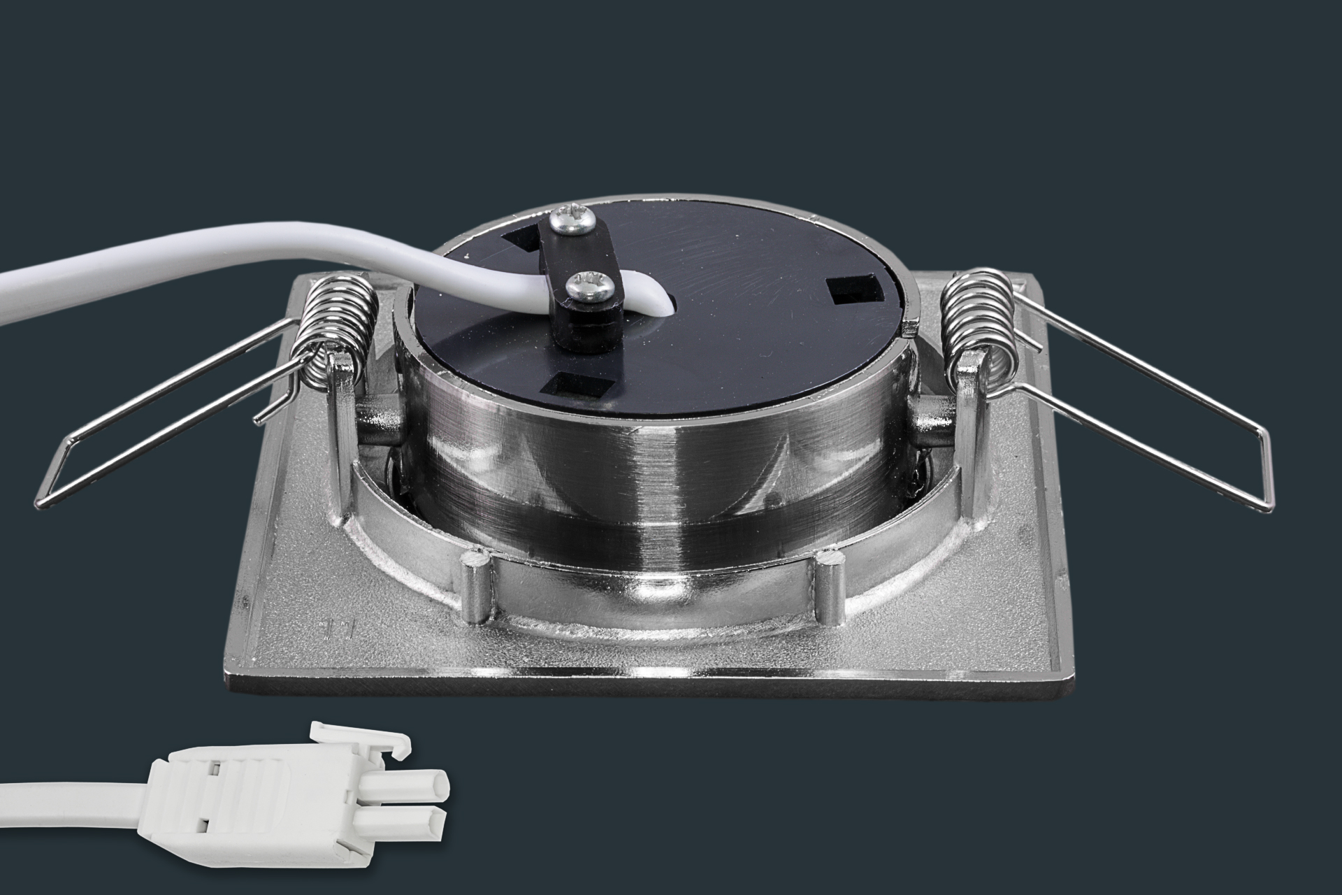 Durch die eckige Bauform der Grundplatte mit einem Kantemaß von 84 mm ist dieser Einbaustrahler ein echter Hingucker in jedem Raum und erzeugt ein modernes Ambiente.
